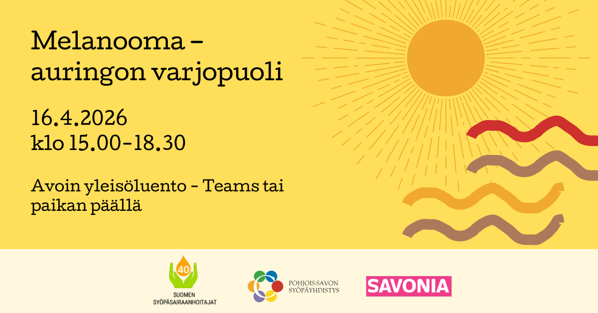 Tervetuloa kaikille avoimeen Melanooma – auringon varjopuoli -luentotilaisuuteen 16.4.2026 klo 15.00-18.30.