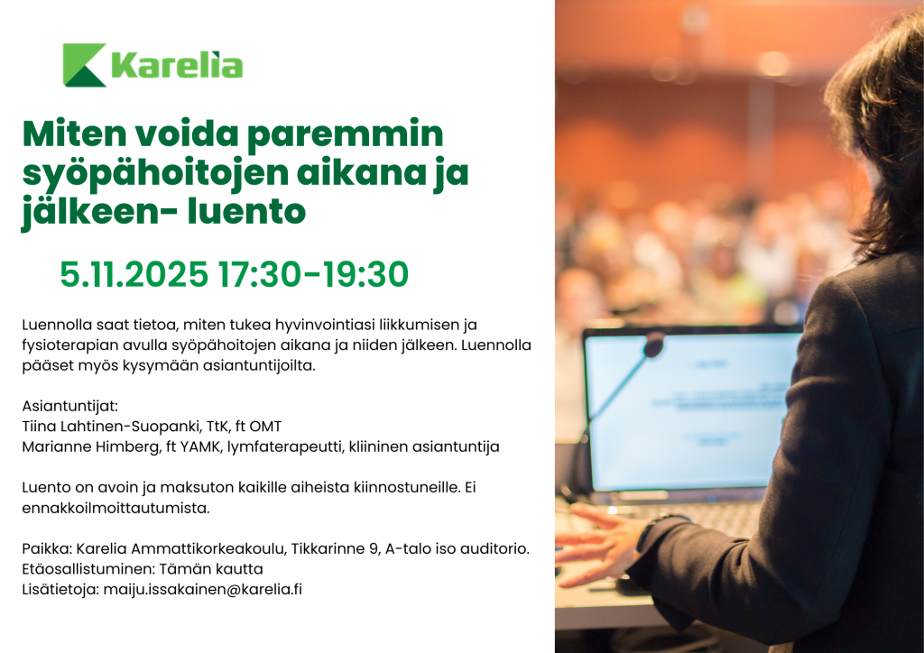 Karelia ammattikorkeakoulu järjestää 5.11. klo 17:30-19:30 kaikille avoimen yleisöwebinaarin hyvinvoinnin tukemisesta liikunnan ja fysioterapian avulla syöpähoitojen aikana ja niiden jälkeen. Webinaari on suunnattu sekä ammattilaisille/asiantuntijoille että sairastuneille ja heidän läheisilleen. Tilaisuuteen on mahdollisuus osallistua myös etäyhteydellä, ennakkoilmoittautumista ei tarvita. Osallistumaan pääsee tästä linkistä: https://karelia-fi.zoom.us/j/84319115751